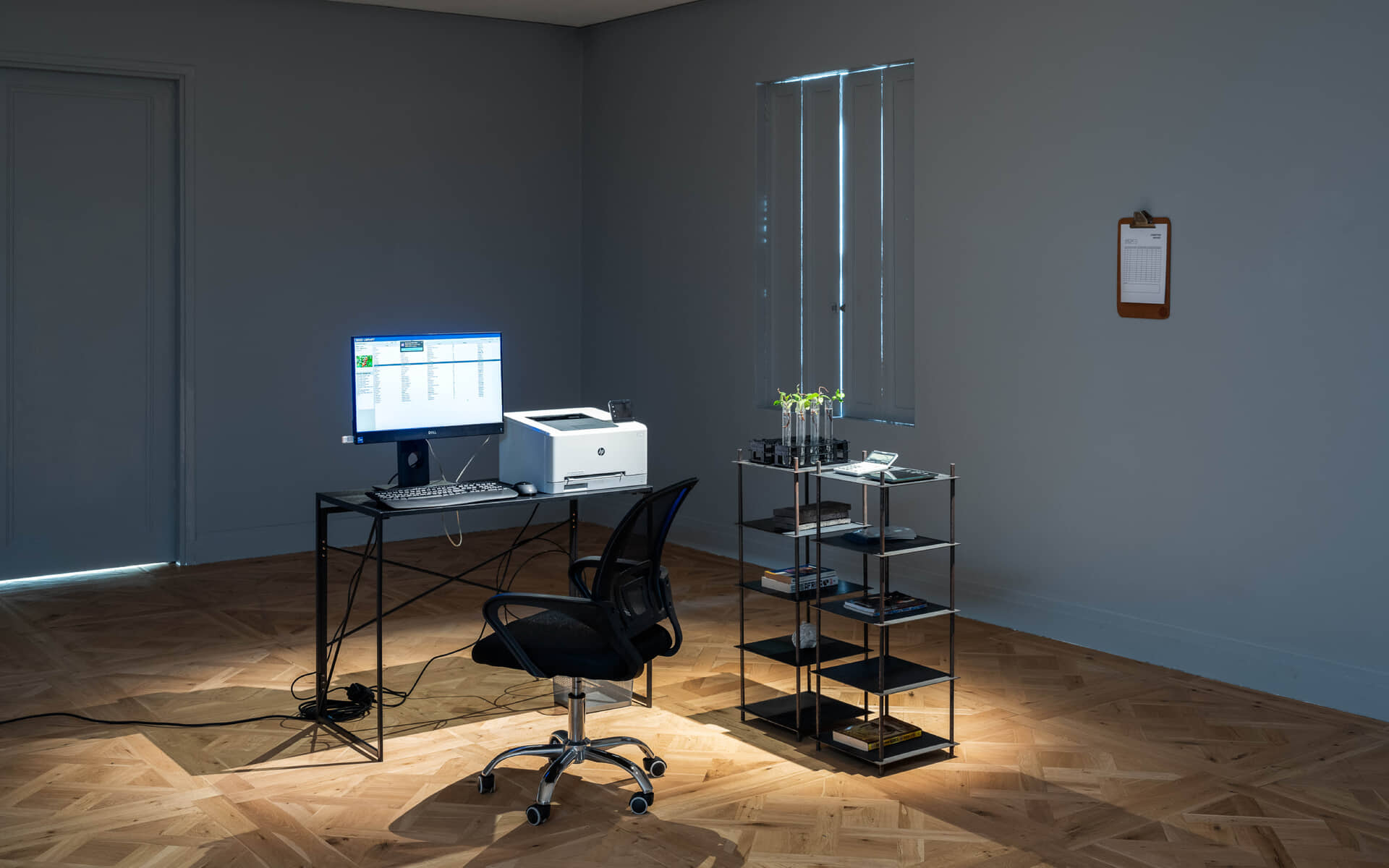 scaffolding for organic matter: a metal shelf displays test tubes of plant cuttings; an electrical refrigerator mechanism continually blows cold air into the exhibition space, maintaining the optimal conditions for the seed bank-seed library and cuttings and seeds to survive and grow. The natural matter finds its way into the show as mechanized, domesticated, serialized, codified, processed, commodified and prepped for exchange.