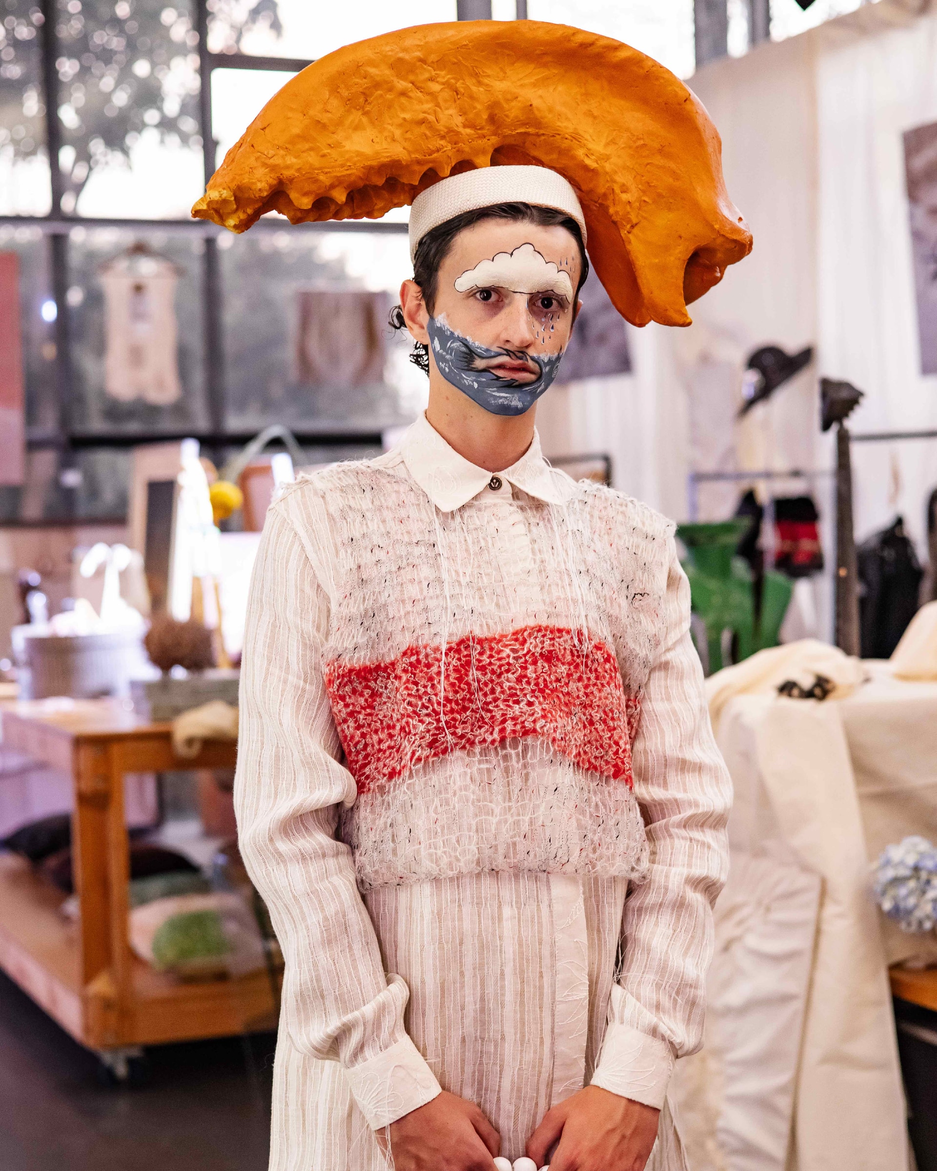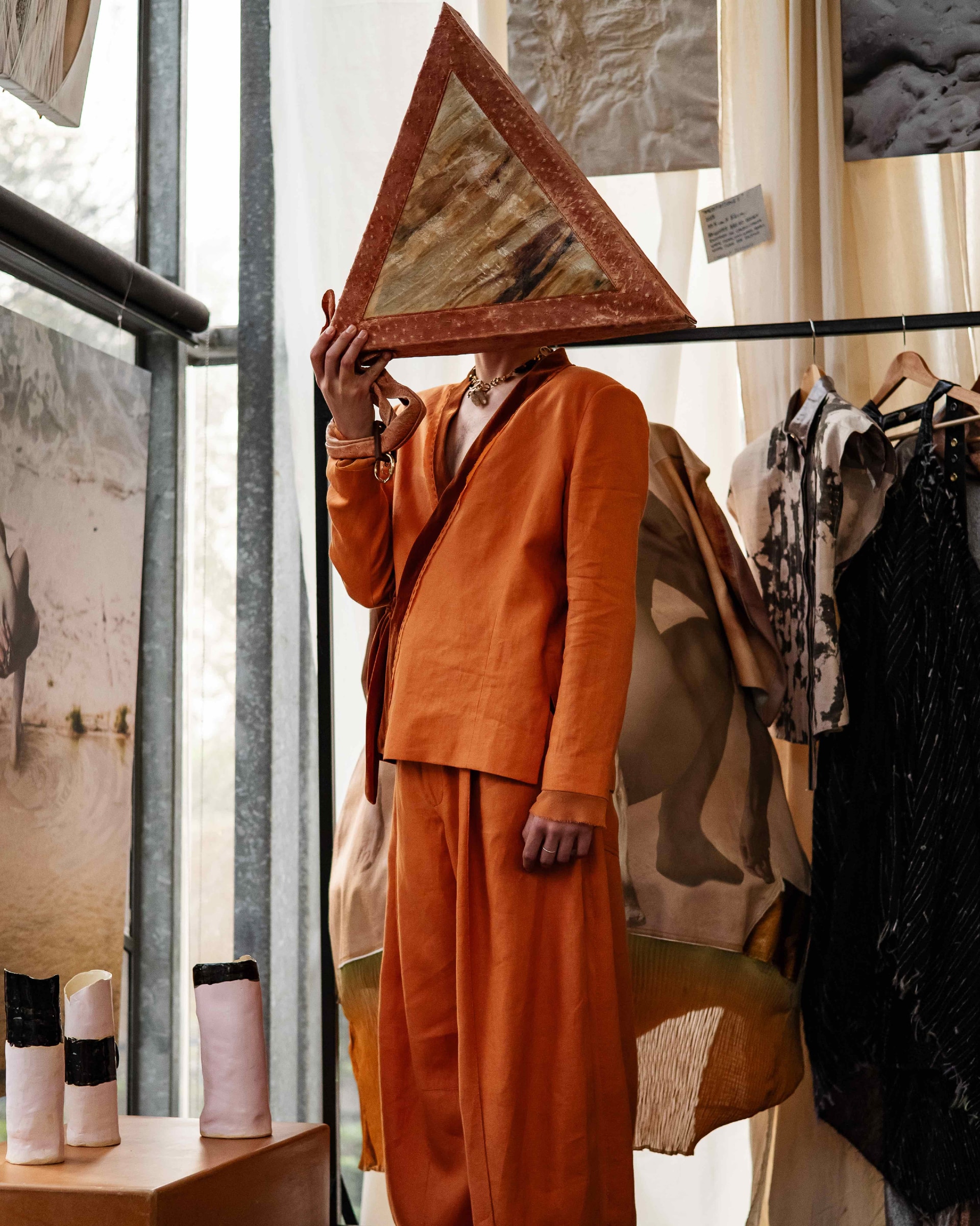 Materials include vintage silk lamé, linen, organic hemp, structured cottons, viscose blends, and metallic threads. ROMO’s metallic yarn, sculptable and malleable, allows garments to hold cocoon-like shapes—a tactile expression of transformation.